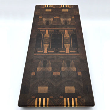 Made to order, by hand, in a small town in Ontario by a true artisan.  This stunning board is available in combinations of Canadian sourced walnut, cherry, and maple.  There are no stains or dyes, only the natural beauty of the wood showcasing designs reminiscent of the beautiful patterns and designs of wooden inlay. Classic and timeless, a true work of art to be cherished.
